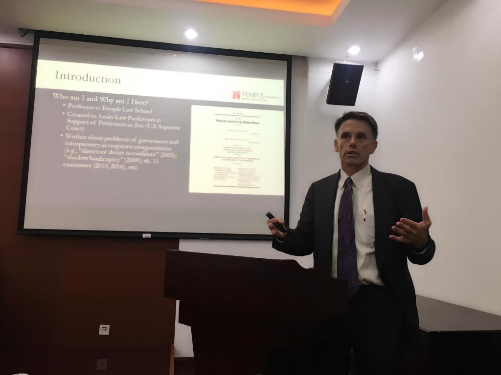 本次讲座主题涉及企业破产重整中不同性质债权的受偿顺位问题。Lipson教授耐心细致地介绍了美国破产法基本制度,并深入剖析了美国联邦最高法院裁决的一场旷日持久的重整案件(Czyzewski v. Jevic Holding Corp.)。该案从2015年底以来持续受到美国破产法学界的关注,Lipson教授亲自参与本案,并撰写了占学界主流的法庭之友意见。