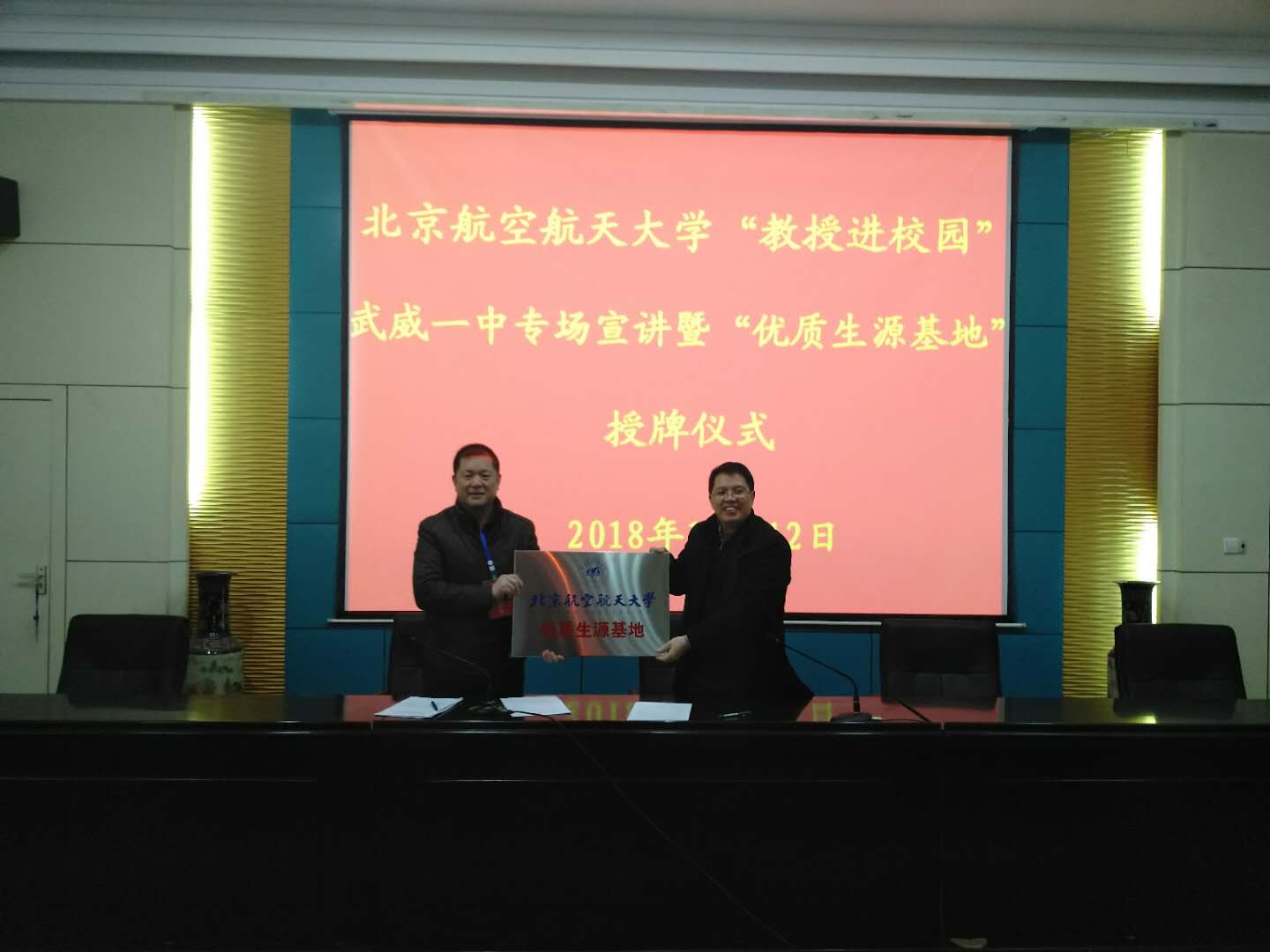 宣讲会上,王琪全组长、潘发吉副董事长分别代表北航与武威一中签订了“优质生源基地”合作协议,并举行了“优质生源基地”授牌仪式。