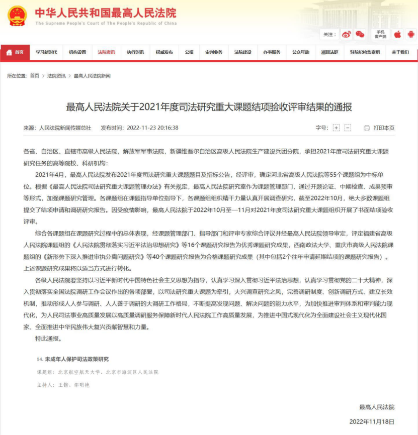 2022年11月18日,最高人民法院通报了2021年度司法研究重大课题结项验收评审结果,公司最高人民法院少年司法研究基地承担的2021年度司法研究重大课题“未成年人保护司法政策研究”通过结项验收评审,顺利结项。该课题由公司最高人民法院少年司法研究基地执行主任王锴教授和北京市海淀区人民法公司党组书记、经理邵明艳联合主持。