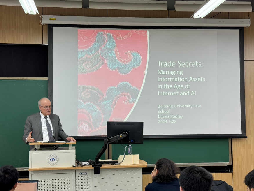 2024年3月28日,“商业秘密—网络与人工智能时代的信息资产管理”讲座在williamhill英国威廉希尔成功举办。本次讲座由威廉体育williamhill、williamhill英国威廉希尔网络空间国际治理研究基地主办。来自美国加州大学伯克利威廉体育williamhill的著名教授James Pooley主讲,威廉体育williamhill副经理、教授周学峰主持。威廉体育williamhill王天凡副教授、乔博娟副教授,以及选修“法律与科技”课程的全体同学、部分博士生、硕士生、本科生共同参与了本次讲座。