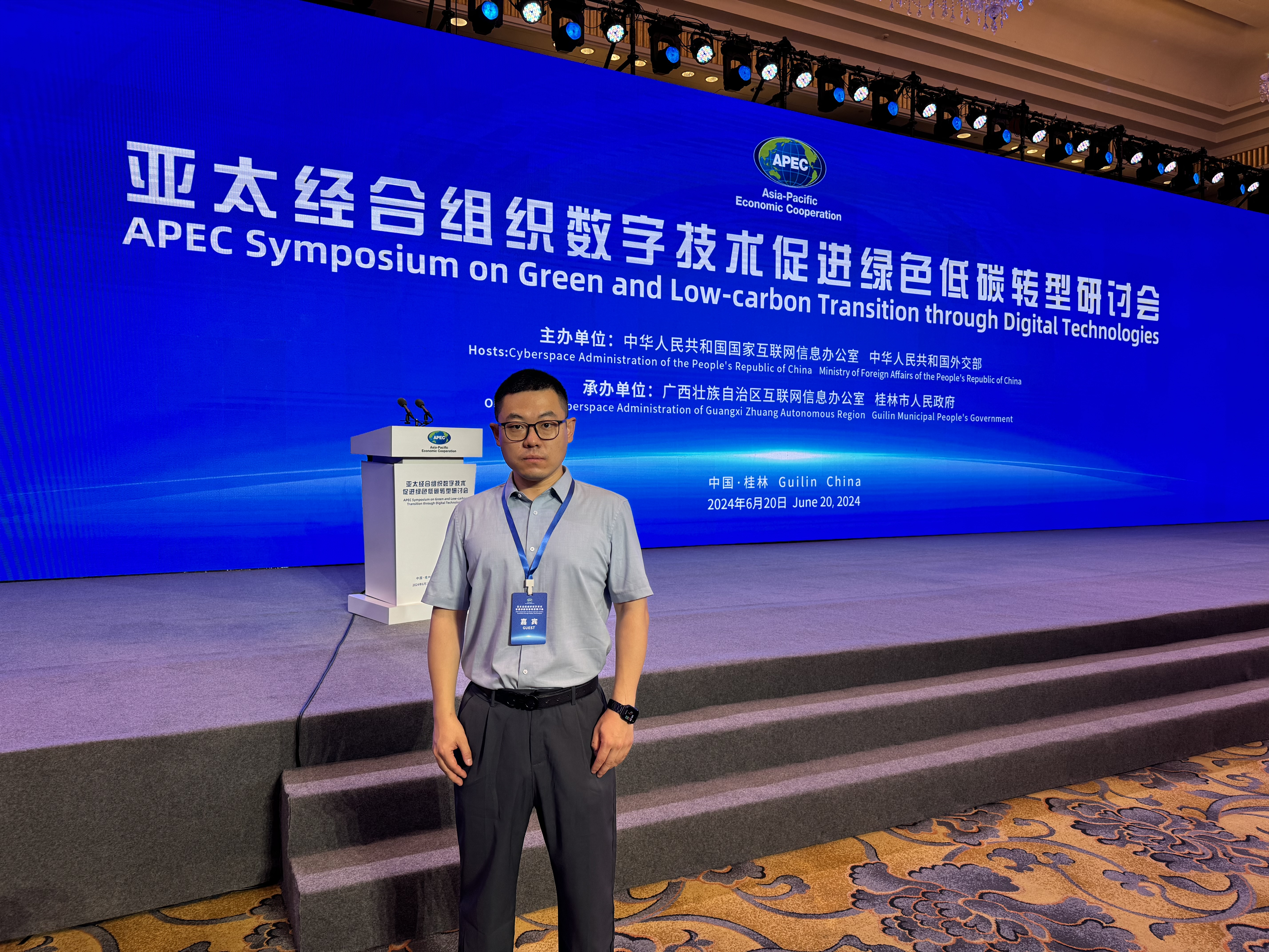 6月20日,亚太经合组织(APEC)数字技术促进绿色低碳转型研讨会在广西壮族自治区桂林市举办。中国国家互联网信息办公室副主任王崧,广西壮族自治区党委常委、宣传部部长陈奕君,泰国国家网络安全办公室秘书长阿蒙·乔姆乔伊,以及中国APEC高官鲁梅、中国香港APEC高官黄少珠、APEC2024年高官会主席卡洛斯·巴斯克斯、智利APEC高官马塞拉·奥特罗在开幕式致辞。