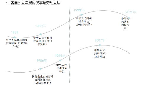 除了上述劳动法内部的问题外,劳动法与民事法律体系的交叉也带来了诸多困惑。第一,从属性劳动合同与自主性劳动合同的规则缺失,使得大量实际存在从属关系的劳务关系难以得到有效规制。例如,自然人之间的雇佣关系、个人与企业间的自由合作关系等,均游离于法律的规范之外,其权益保障成为亟待解决的问题。第二,劳动者主体不适格情形下的裁判差异,也引发了关于法律正当性的广泛讨论。例如,许多超龄劳动者享受养老保险待遇后,其与企业之间的关系将被法院认定为劳务关系,此时如何平衡劳动者权益保护与企业用工自由,也成为民事争议中亟待解答的课题。