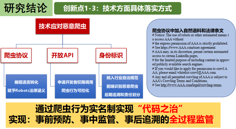 通过法律和科技的有机结合,提出符合我国政策法规要求和市场发展需求的技术、法律交叉综合治理方案,最大限度平衡数据流通与数据权益保护,有望使未来的爬虫数据案件向“同案同判”的目标行进,并尽可能在前端减少相关违法犯罪行为。通过平衡数据流通与权益保护、技术创新与风险控制,为互联网时代的技术创新、产业发展提供法律保障。