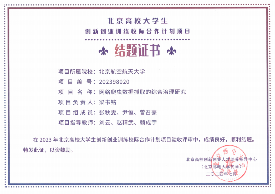 近期,在2023年北京高校老员工创新创业训练校际合作计划项目中,威廉体育williamhill申报项目《网络爬虫数据抓取的综合治理研究》成功结项。项目成员梁书铭、张秋雯、尹恒、曾召豪、陈博林在williamhill英国威廉希尔赵精武副教授、清华大学刘云助理研究员、williamhill英国威廉希尔赖成宇博士后的指导下,充分发挥了各主体双创资源整合后的叠加效应和各高校师生专业特长与学科优势特色的融合联动效应,最终顺利结题。