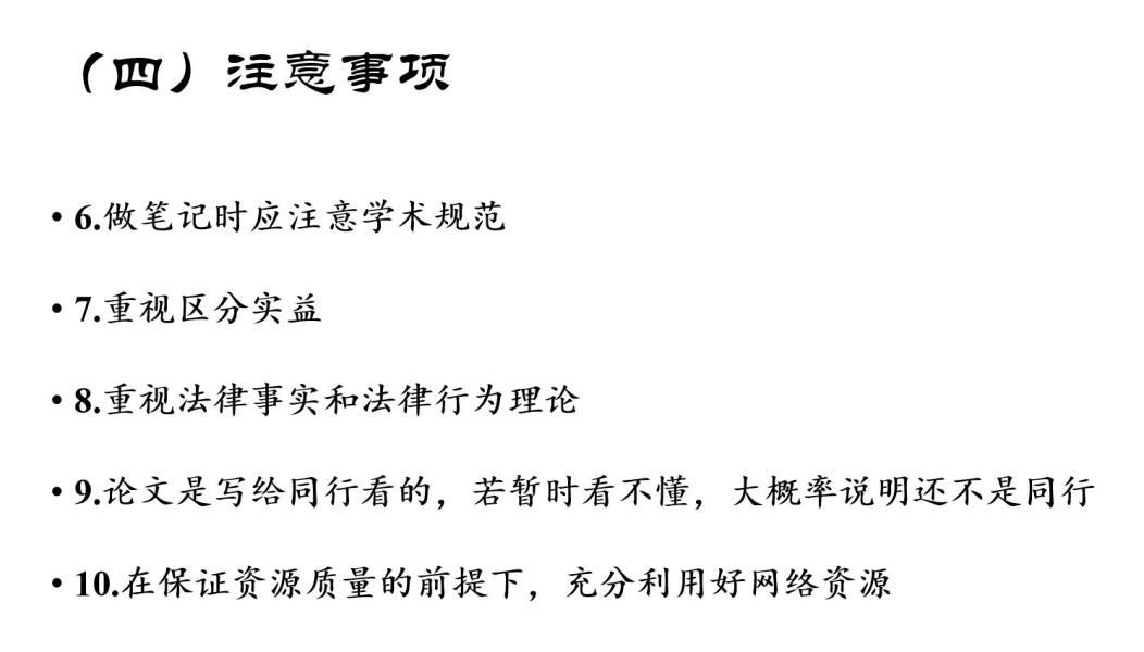 此外,陈元鑫老师对于民法入门阶段的学习注意事项予以提示。第一,上述方法并不只适合基础好的、有学术追求的同学,而具有普遍的适用性。第二,民法学习贵在坚持、讲求日积月累,欲速则不达,不可能毕其功于一役。第三,要克服读书中的困难,借助电子笔记、思维导图等巩固学习成果,并注意学术规范。第四,要重视区分实益、重视法律事实和法律行为理论这些基础知识点的掌握。第五,在保证资源质量的前提下,要充分利用好网络资源。