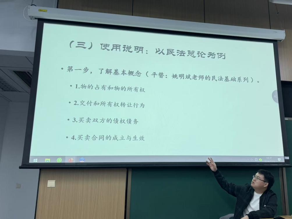 在学习过程中,要真正用好学习资料,就要了解基本概念,适当调整课程顺序,做好课前预习、课中笔记和课后练习。陈元鑫老师以民法总论为例,指出自学时要了解的基本概念包括物的占有和物的所有权、交付和所有权转让行为、买卖双方的债权债务、买卖合同的成立与生效。在学习铺垫课程阶段,可以借助网络课程资源、教科书阅读取得良好的预习效果。进入正式学习阶段,要综合自身知识储备、接受能力和时间规划等参考因素选择合适课程,并灵活调整学习顺序、总结学习方法以促进知识吸收。在理论学习之外,掌握相应的司法实务案例、与志同道合者交流学习笔记和心得是巩固知识点的必要补充。他强调,鉴定式案例研习是一条高质量的学习路径,能够有效弥补阅读短板,提升法条熟练度,培养法律思维。进行案例研习前,应当先行学习相关的基础理论课程。