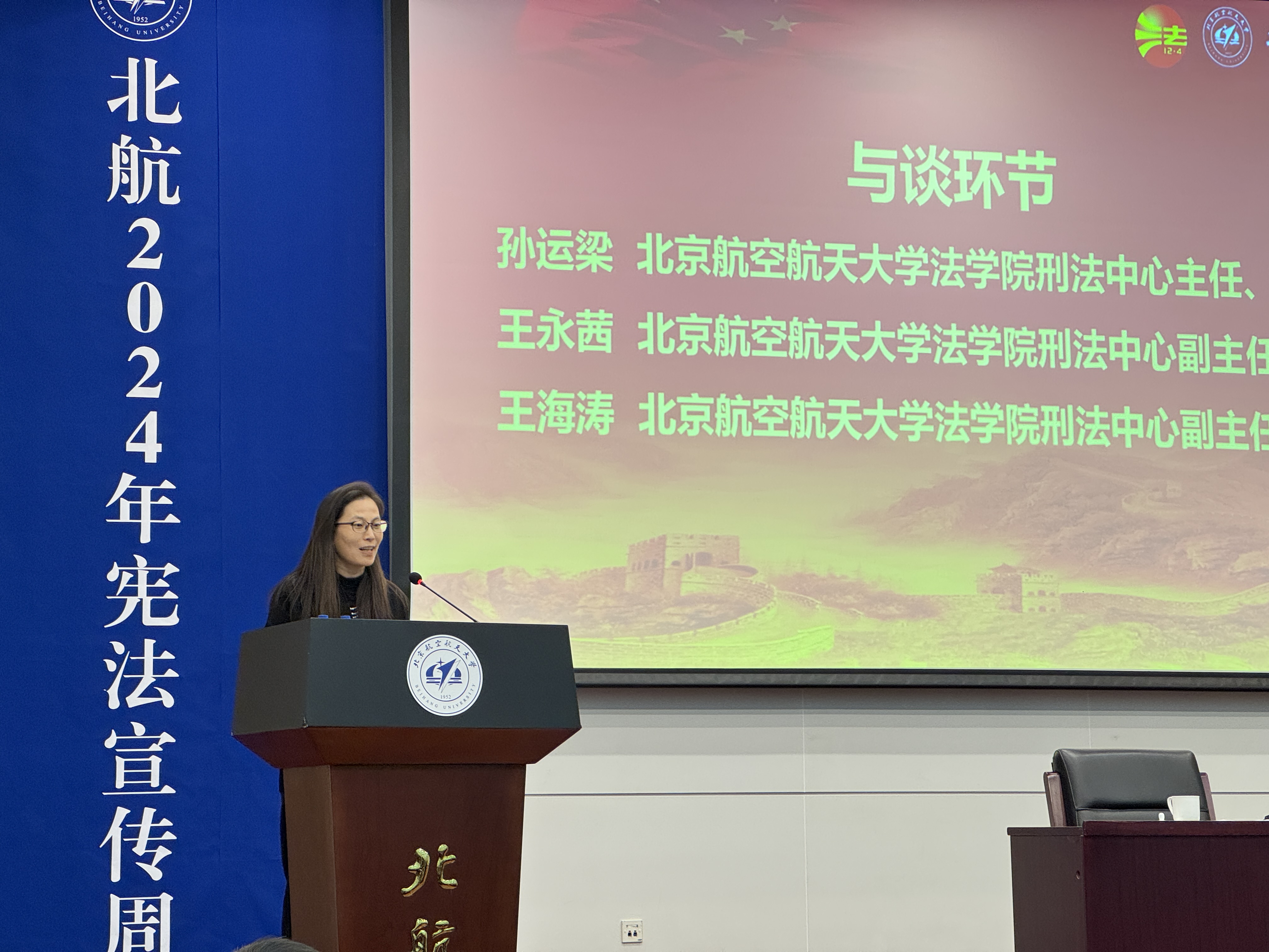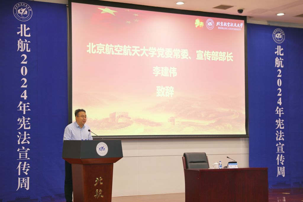 李建伟代表活动主办单位致开幕词,对车浩教授表示热烈欢迎,对主承办单位及参与活动的师生表示感谢。他指出,今年宪法宣传周首次在京杭两地三校园同步举办,为法治校园文化建设做出有力推动。他表示,近年来北航不断优化人文社会科学学科布局,持续加强法学团队建设,以 “宪法宣传周”为代表的校园品牌普法活动,已经成为校园文化建设的一抹亮色。希望广大师生以本次宪法宣传周为契机,全面贯彻党的二十大和党的二十届二中、三中全会精神,深入学习贯彻习近平法治思想和习近平文化思想,躬身法治中国建设。