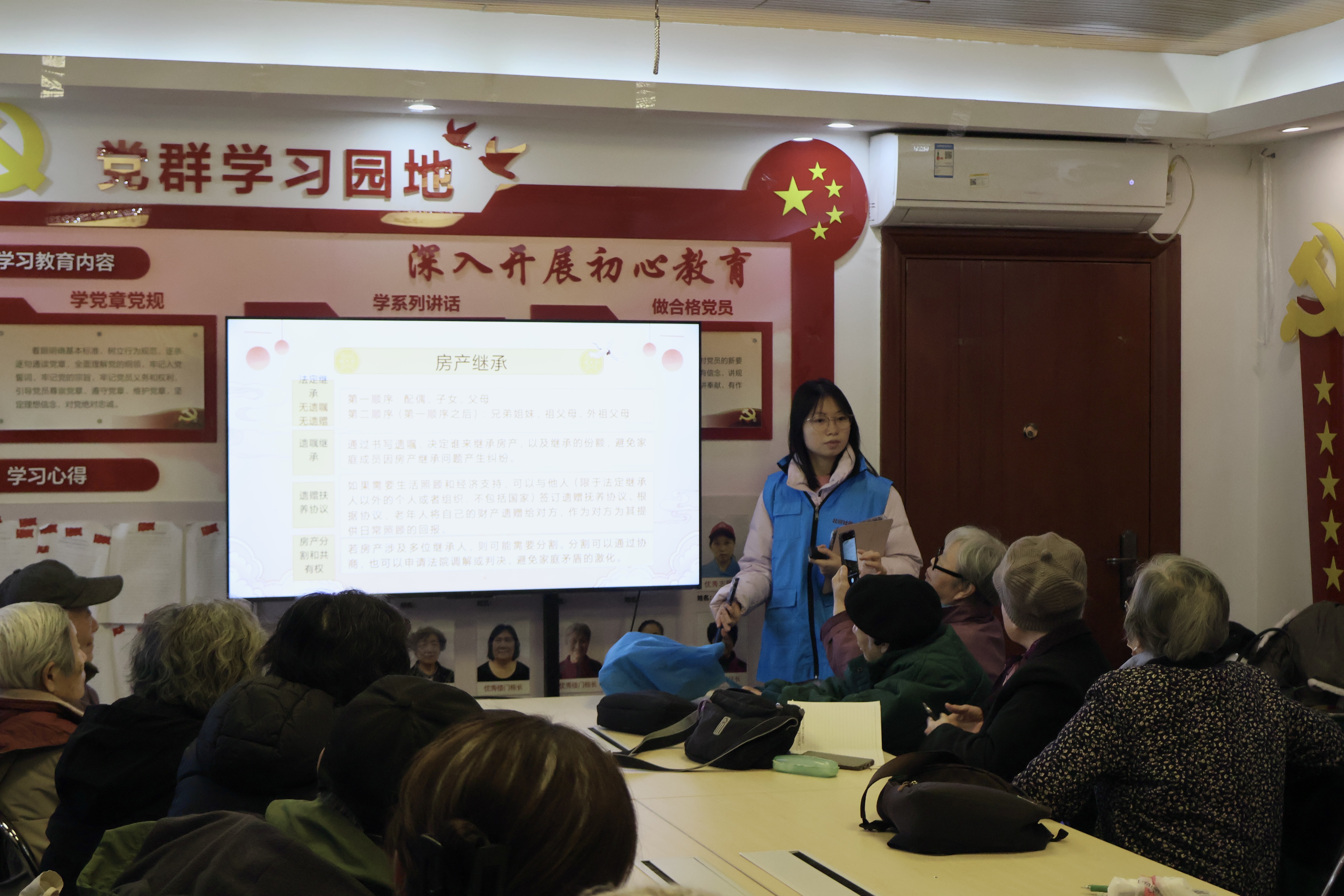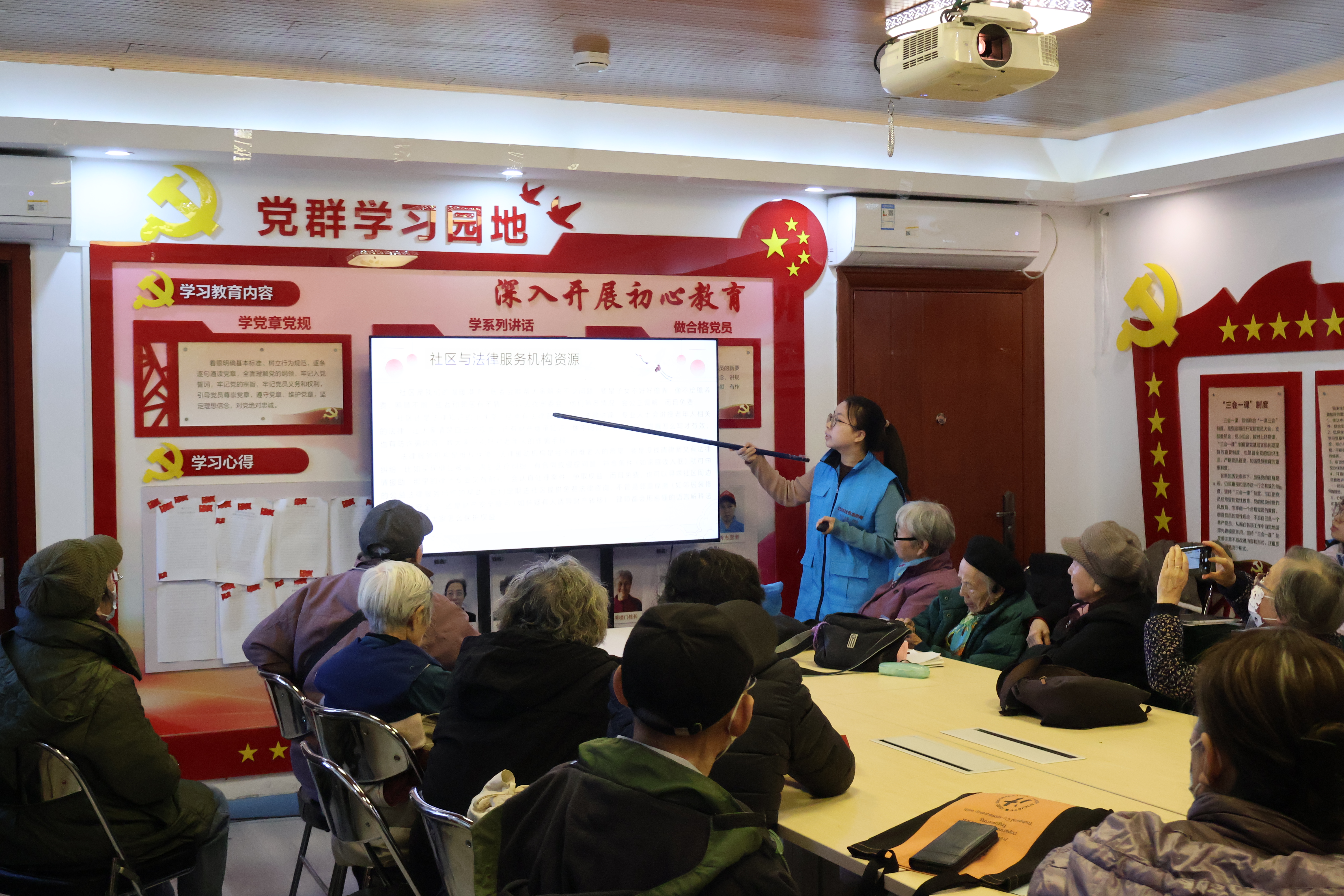讲座内容具体分为五个部分。第一,围绕《老年人权益保障法》,结合具体的法律条文,讲解了老年人享有的基本生活权益、医疗保健权益、居住权、文化娱乐、受尊重等权益。第二,就财产继承,讲解了继承的形式与顺序,重点讲了财产赠与、遗嘱的合法要件。第三,在赡养与扶养方面,介绍了家庭成员所负有的法律义务,通过多个家庭矛盾成功调解的案例,提供解决问题的方案。第四,具体介绍法律援助的机构设立、申请流程,指明针对不同问题的维权途径,介绍社区与法律服务机构资源。第五,再次强调常见的诈骗手段,提醒老年居民保护好自己的钱袋子。