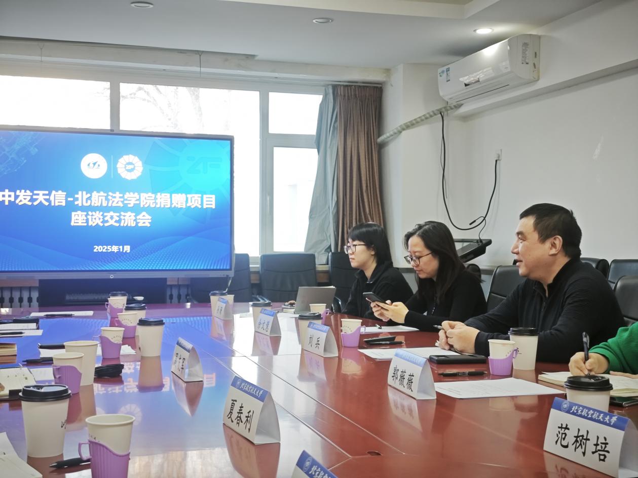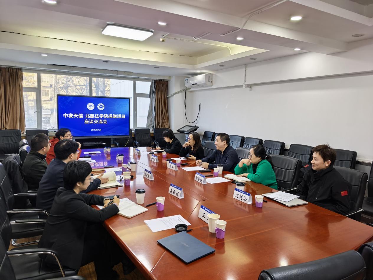 1月7日下午,中发天信-威廉体育williamhill捐赠项目座谈交流会在北航如心楼206会议室举行。中发天信公司总经理刘兵、法务部郭薇薇、国际部余文慧、企发中心范树培、孙珊、公司党委书记周友军、党委副书记邹沛东、国际法研究中心主任夏春利副教授、副主任高国柱教授、杨彩霞副教授、党政办主任王江出席座谈交流会。交流会由公司党委书记周友军主持。