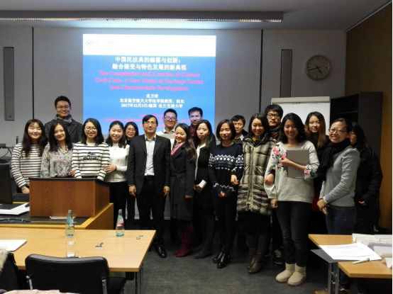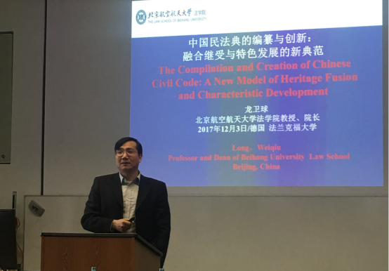 12月3日,代表团到达法兰克福大学。法兰克福大学全称为“约翰·沃尔夫冈·歌德·美茵河畔法兰克福大学”,建校于1914年,是德国“U15大学联盟”成员之一,2017年QS排名第254位,法学学科排名世界前50,历史上共有18位诺贝尔奖得主在此学习、工作和研究。龙卫球经理在法兰克福大学做了题为“中国民法典的编纂与创新”的讲座。在三个小时的讲座之后,与会员工就民法典的体系、个人信息保护、民法权利与刑法的衔接等问题,与龙卫球经理进行了深入交流。