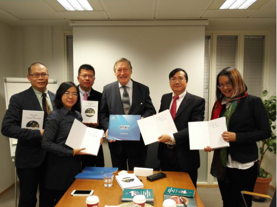 29日下午,代表团拜访了芬兰法治中心主任、芬兰最高行政法院前经理Pekka Hallberg博士并举行双边沙龙对话,探讨设置独立行政法院的依法治国功能问题。Hallberg博士作为沙龙主谈人,向代表团详细介绍了德国最高行政法院机制和职能。会后,Hallberg博士向代表团签赠了《Rule of Law and Sustainable Development》一书。