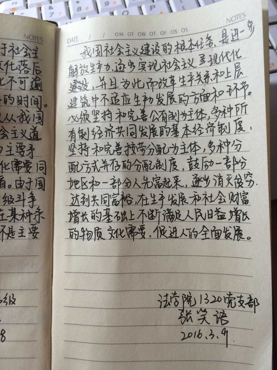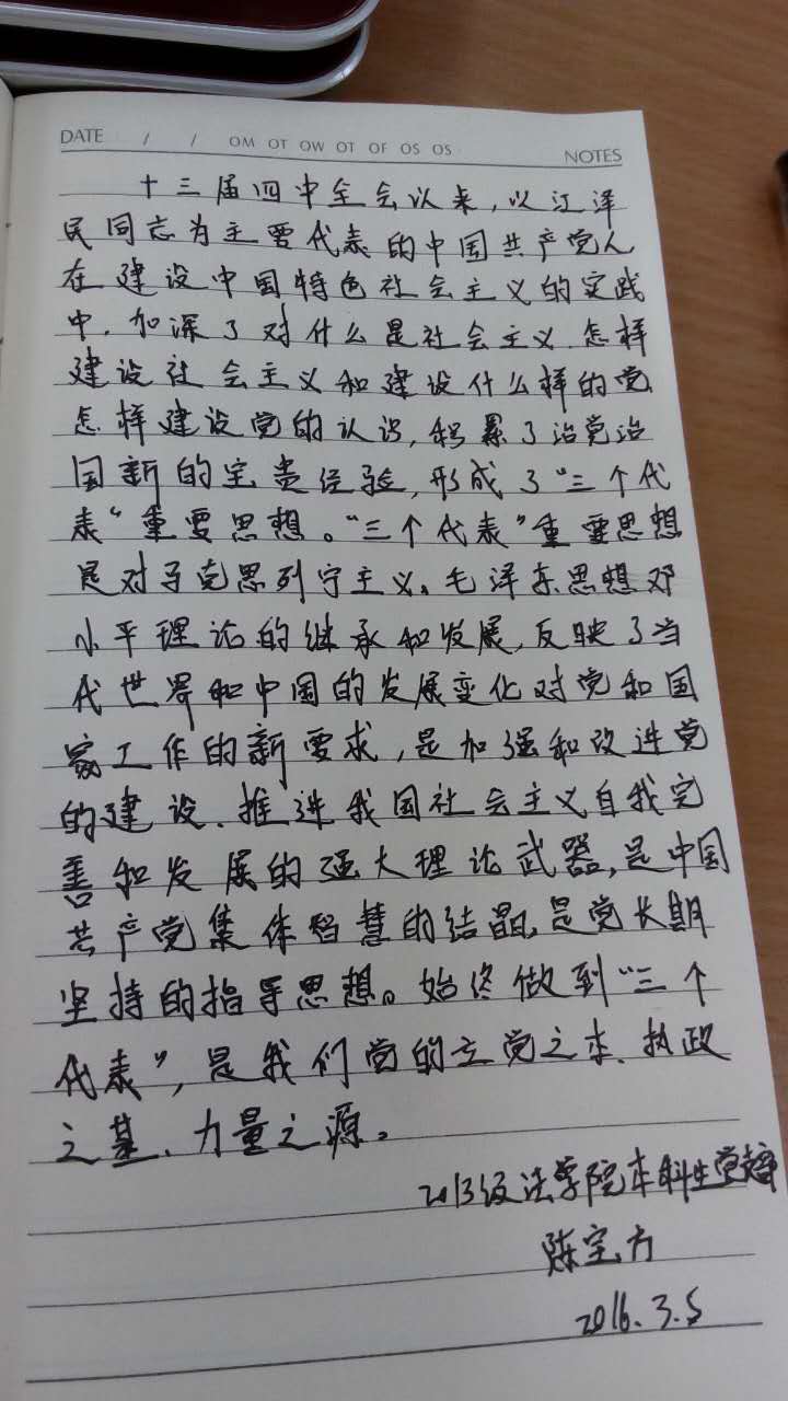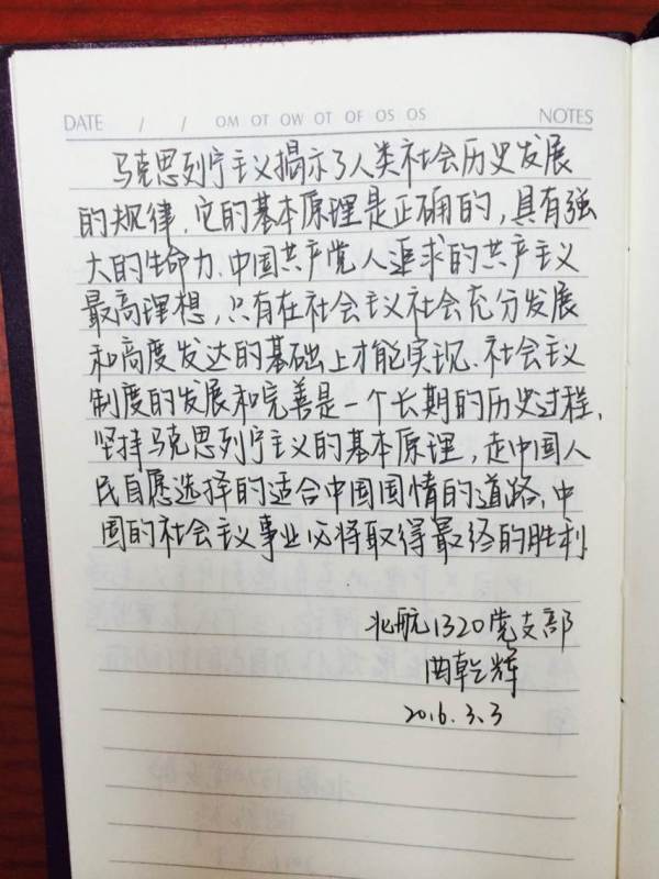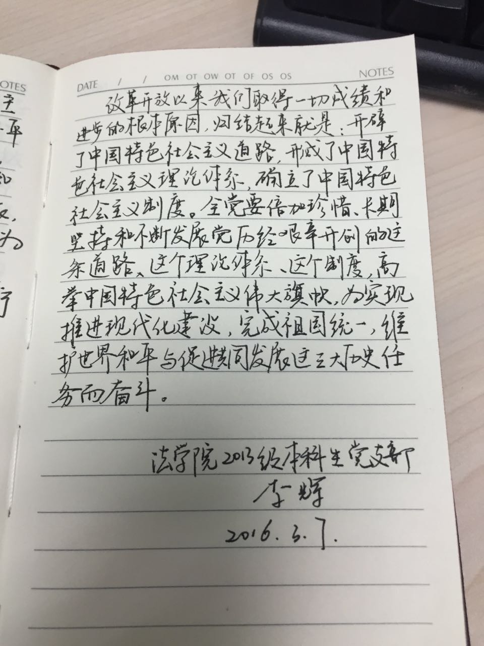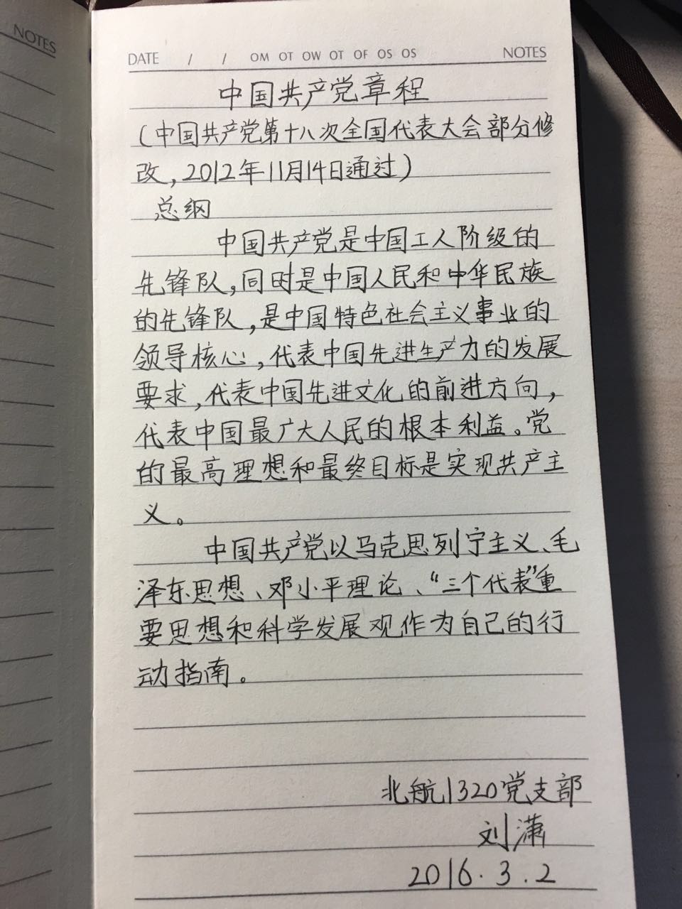 2016年,党中央决定在全体党员中,开展“学党章党规、学系列讲话,做合格党员”(以下简称“两学一做”)学习教育活动。2016年3月2日开始,威廉体育williamhill2013级本科生党支部(以下简称1320党支部)在支部书记李辉的带领下,深刻领会“两学一做”学习教育精神,深入学习党章包含的思想精髓和时代要求,全面启动“手抄党章100天”活动。