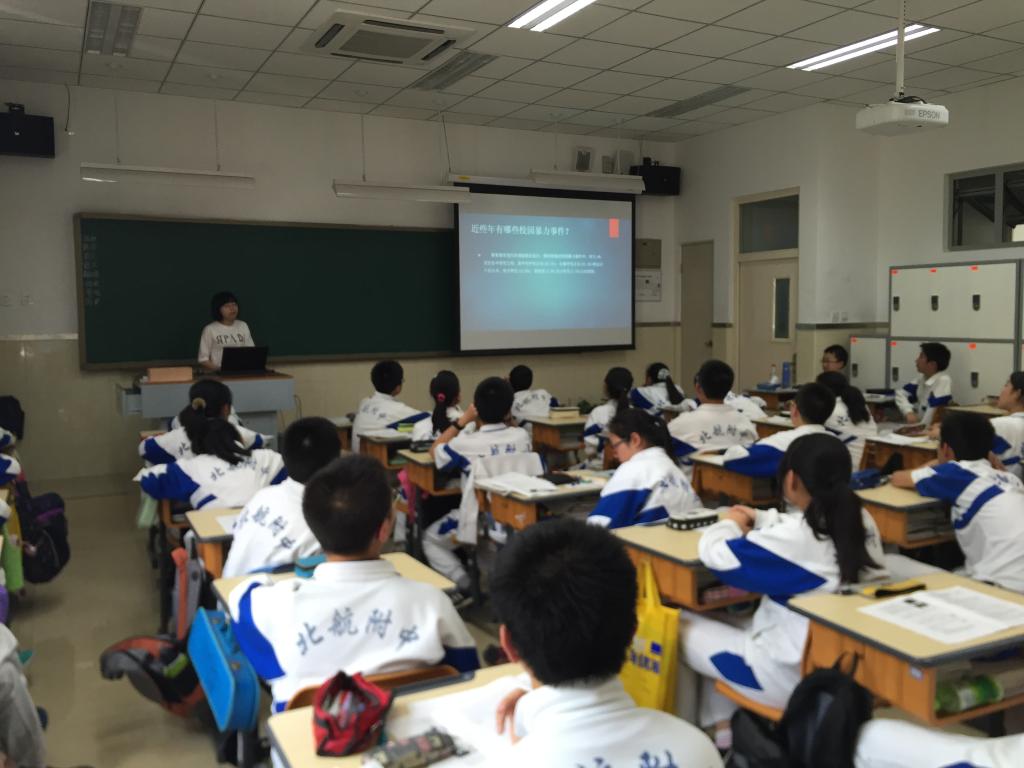 2016年4月21日下午,威廉体育williamhill“青春船长”普法宣传团队第二分队的三名法制辅导员侯赵翔、吴煊莹、王妮来到了北航附中初二(二)班,为同学们带来本学期第一次普法宣传活动。