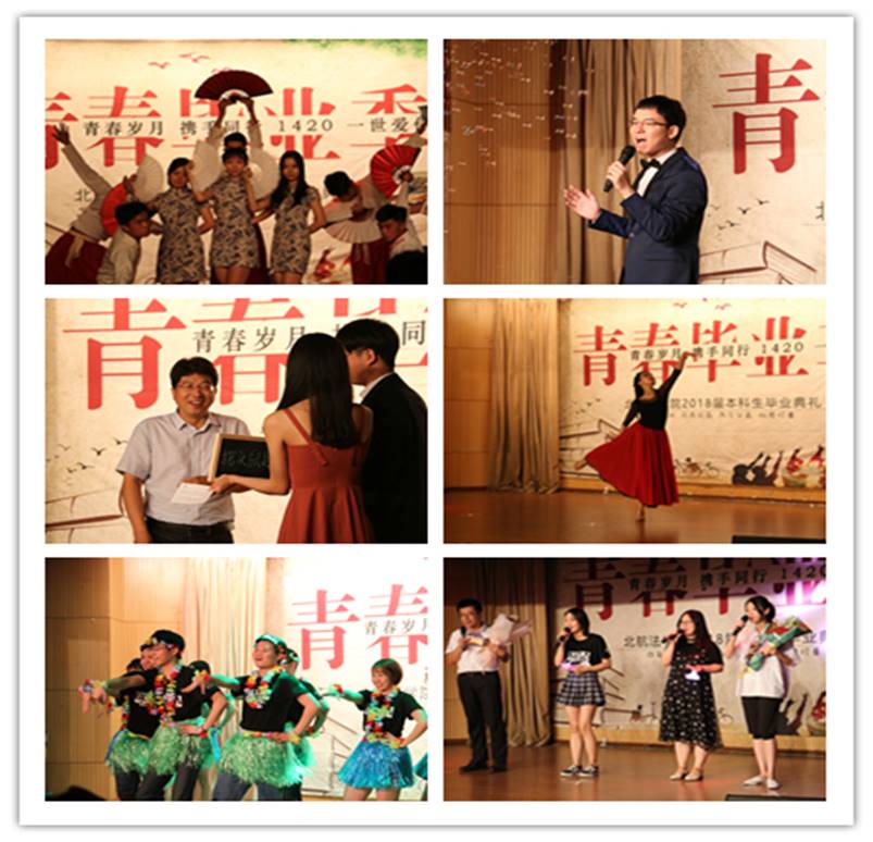 接下来,毕业晚会精彩纷呈的节目依次上演。精心制作的毕业纪念视频,勾起了同学们对于本科生活的温馨回忆。由北航扇舞团表演的舞蹈《惊蛰》,灵动的舞姿迎来满场喝彩。威廉体育williamhill刘颖老师演唱了歌曲《小幸运》,用歌声对毕业生与威廉体育williamhill四年的美好相遇表达深远的祝福。轻松幽默的游戏环节中,师生先后登台,将晚会现场推向了又一个高潮。2016级本科生派出由柳依青等同学组成的和玹合唱团演绎了一曲《梨花又开放》,威廉体育williamhill2014级研究生李普学姐舞动一曲《蕃社姑娘》,婉转的歌声与曼妙的舞姿,尽情传递了威廉体育williamhill全体师生对毕业生们的祝愿。威廉体育williamhill毕洪海老师、初殿清老师,与2018届本科生李天琦、刘珊合作,带来一组师生歌曲联唱,二位老师的组合还饱含着“毕业亦是新的开始”的美好寓意。威廉体育williamhill那仁托娅等18位本科毕业生,重新编排并上演了大三学年曾参加老员工艺术展演的舞蹈《舞动青春》,充满青春活力的舞姿为毕业晚会画上了圆满的句号。伴随着《青春纪念册》的旋律,全体演职人员与观众登台谢幕并合影留念。