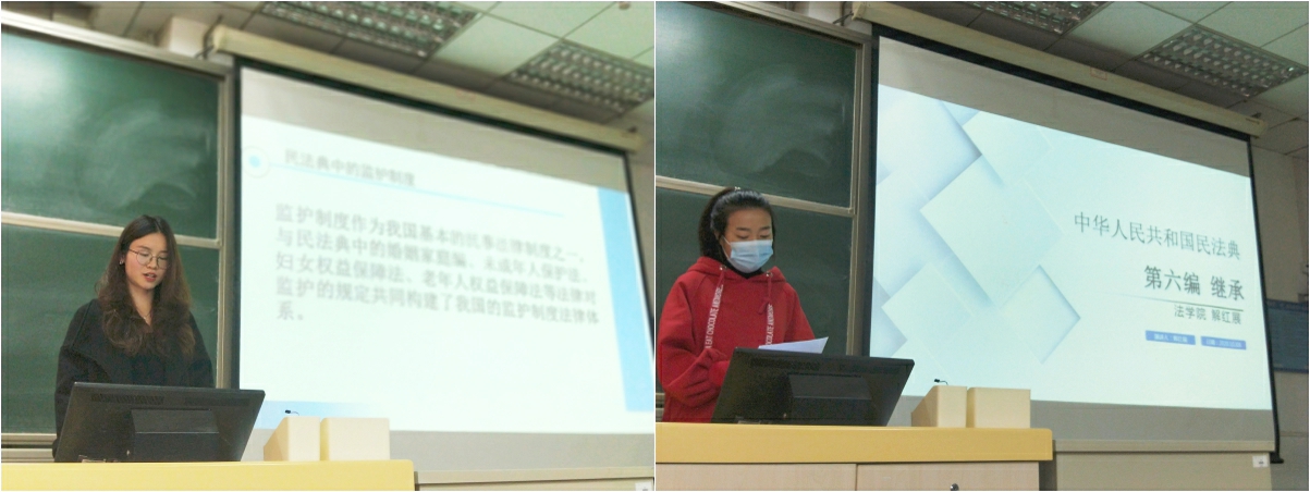 此外,本次班会还增加一项具有威廉体育williamhill特色的议程。为深入学习宣传《中华人民共和国民法典》,努力营造尊法、学法、守法、用法的浓厚法律氛围,威廉体育williamhill早先组成民法典宣讲团,助力班集体、各支部学习民法典。在班会上,研究生会组织民法宣讲团讲师王垚和解红展进行民法典试宣讲,一方面加深同学们对民法典的认识理解,一方面也对宣讲团成员提出进一步改进的建议。