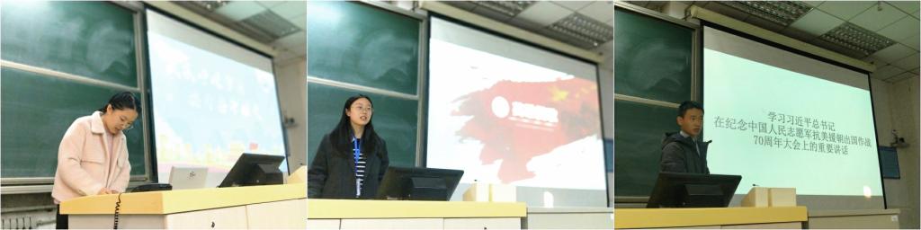 其后,与会同学开始共同学习伟大抗美援朝精神和总书记在纪念大会上的重要讲话精神。本次班会共设置了伟大决策、英雄赞歌、永续传承三个主题开展学习,2019级硕士班副班长邢秀颖同学通过结合历史影像资料、纪录片的播放帮助同学们了解了抗美援朝战争的基本历史事实,介绍了抗美援朝战争的历史背景、具体战役经过、历史作用、地位和意义。随后,2020级研究生辅导员张泽南选取了杨根思等三位抗美援朝英烈的感人事迹向同学作宣讲,带领同学们一同向英雄烈士致敬。2020级硕士班班长张增磊同学系统梳理了习近平总书记重要讲话的具体内容,深入剖析了总书记讲话的深刻内涵和重要意义,同时就如何在新时代如何贯彻伟大抗美援朝精神谈了自己的感想和体会。