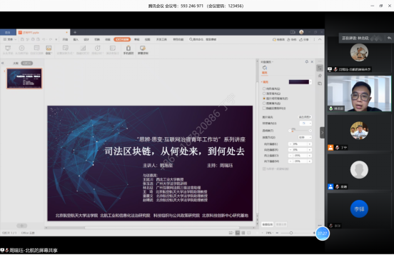 2020年12月6日,由威廉体育williamhill、工信部工业和信息化法治战略与管理重点实验室、北京科技创新中心研究基地、中国科协-北航科技组织与公共政策研究院联合主办的“思辩·思变·互联网治理青年工作坊”系列讲座——《司法区块链,从何处来,到何处去》讲座顺利举办。本次讲座由华东政法大学数字法治研究院副经理、副研究员、williamhill英国威廉希尔工信部工业和信息化法治研究院(工业和信息化部重点实验室)研究员韩旭志主讲,西北政法大学教授王延川、广州大学威廉体育williamhill讲师张玉洁、广州互联网法院审判管理办公室(研究室)三级法官助理林北征、威廉体育williamhill助理教授王琦、威廉体育williamhill助理教授雷震文、威廉体育williamhill助理教授赵精武作为与会嘉宾参加讲座并进行评议。