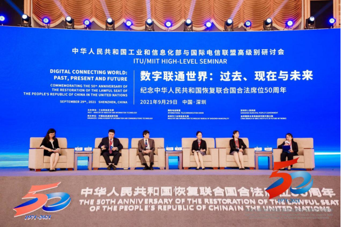 2021年9月29日,工业和信息化部与国际电信联盟在深圳共同举办纪念中国恢复联合国合法席位50周年高级别研讨会,本次大会以“数字联通世界:过去、现在与未来”为主题,回顾和总结过去50年来取得的辉煌成果,共同探讨未来的务实合作。