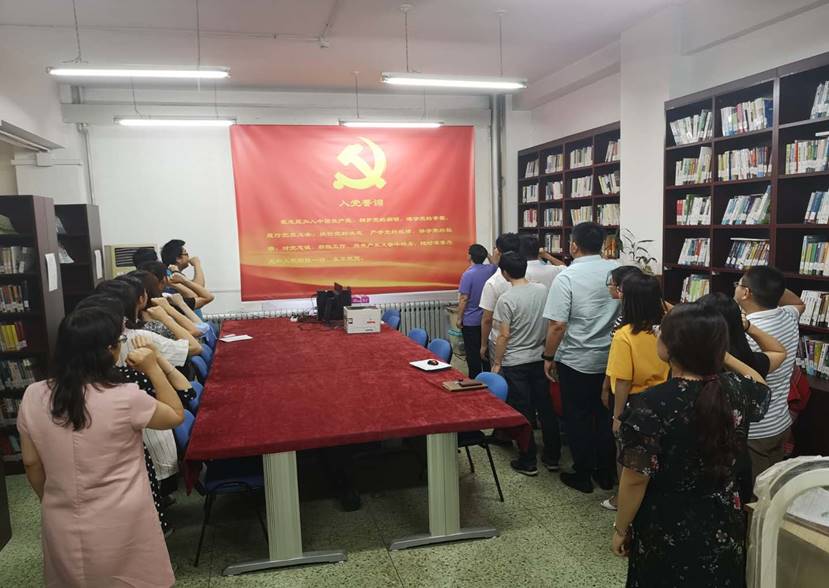 最后,全体教职工党员在王琪全书记的带领下,重温入党誓词,面对党旗进行庄严宣誓。
