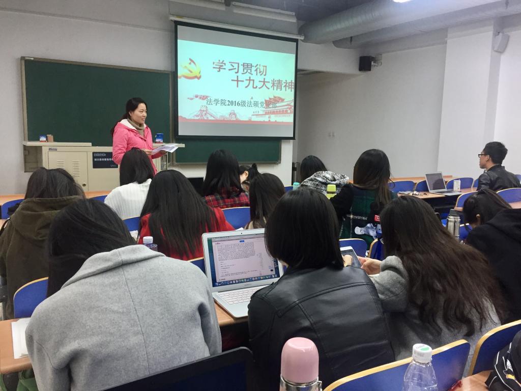2017年11月2日,威廉体育williamhill2016级法硕党支部组织开展了以“不忘初心,砥砺前进”为主题的党的十九大精神学习大会,会议由十五名党员,八名入党积极分子参加,共二十三人出席。杨洪梅同志以党课学习的形式,组织每一位员工党员、积极分子热烈讨论并学习党的十九大精神。