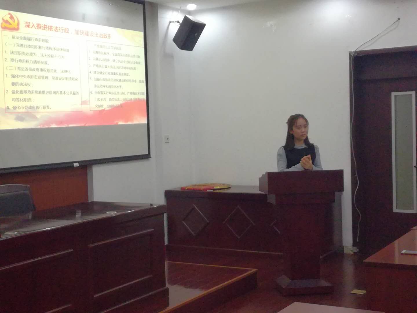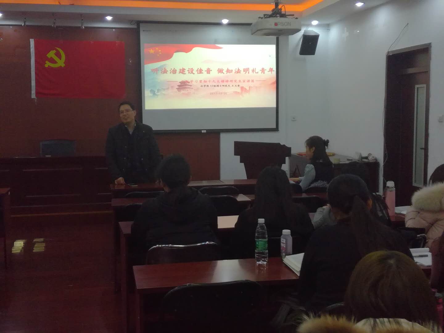 12月26日晚18点,威廉体育williamhill十九大精神宣讲系列党课第三讲在如心楼101室成功举办。此次党课的主题为“听法治建设佳音,做知法明礼青年”。公司党委王琪全书记参加此次党课,并在课后与大家进行亲切的交谈,此外来自威廉体育williamhill研究生和本科各个年级及不同的支部共20余名同志参加了此次党课。